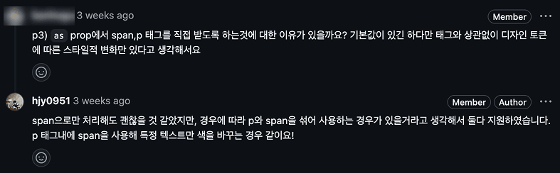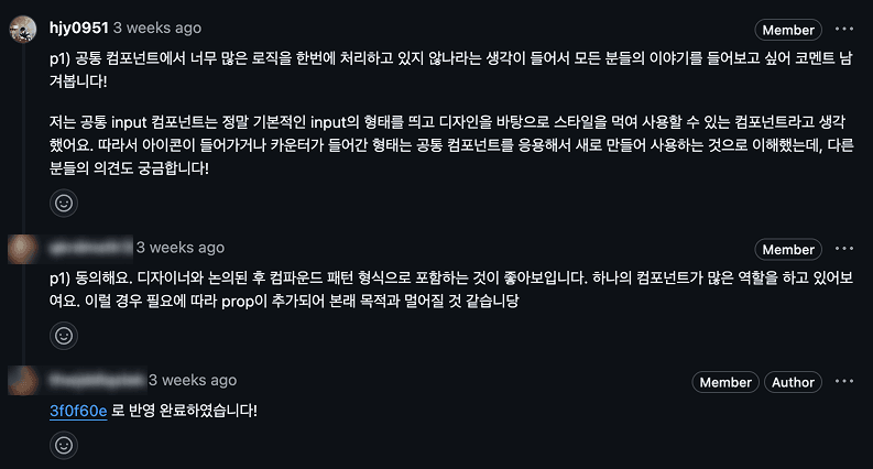 그리고 P1, P2에 대해서는 리뷰 작성자의 의견 강도가 어느 정도 반영되어 있어서 PR 작성자가 코드를 작성한 의도를 말하고 이에 대한 토론으로 이루어지는 경우가 많아 의견을 좀더 편하고 수월하게 남길 수 있었던 것 같다.